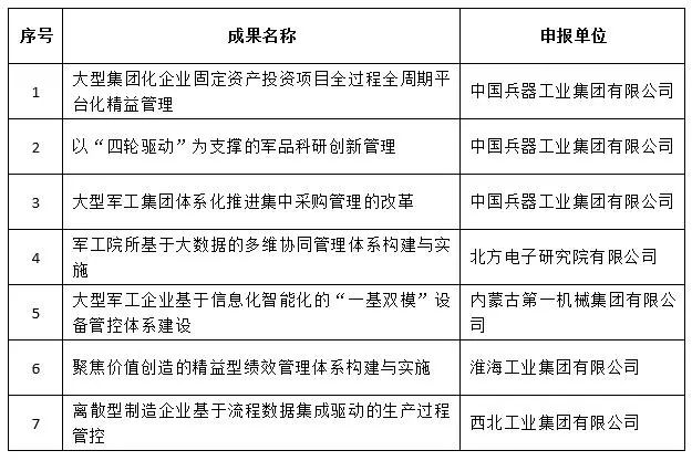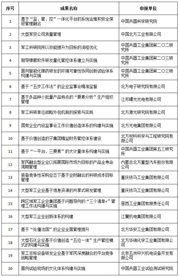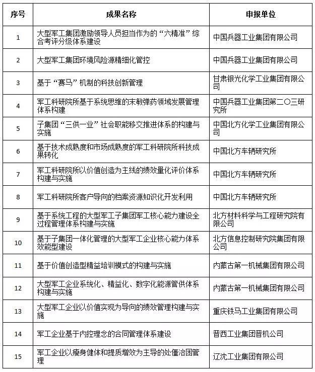 近日,中國兵器工業(yè)集團(tuán)4項(xiàng)創(chuàng)新成果獲全國企業(yè)管理現(xiàn)代化創(chuàng)新成果獎(jiǎng)、42項(xiàng)創(chuàng)新成果獲國防科技工業(yè)企業(yè)管理創(chuàng)新成果獎(jiǎng)。 全國企業(yè)管理現(xiàn)代化創(chuàng)新成果 經(jīng)全國企業(yè)管理現(xiàn)代化創(chuàng)新成果審定委員會終審,第二十五屆全國企業(yè)管理現(xiàn)代化創(chuàng)新成果公布,中國兵器工業(yè)集團(tuán)4項(xiàng)創(chuàng)新成果榮獲二等獎(jiǎng)。 二等獎(jiǎng) 國防科技工業(yè)企業(yè)管理創(chuàng)新成果 2018年度國防科技工業(yè)企業(yè)管理創(chuàng)新獲獎(jiǎng)成果名單發(fā)布,中國兵器工業(yè)集團(tuán)共獲獎(jiǎng)42項(xiàng),其中:一等獎(jiǎng)7項(xiàng),二等獎(jiǎng)15項(xiàng),三等獎(jiǎng)20項(xiàng)。獲獎(jiǎng)總量及一等獎(jiǎng)數(shù)量均位于軍工集團(tuán)首位。 一等獎(jiǎng) 二等獎(jiǎng) 三等獎(jiǎng) 據(jù)悉,2018年度的國防科技工業(yè)企業(yè)管理創(chuàng)新評審工作,經(jīng)專家初審、函審、一等獎(jiǎng)候選成果答辯、專家會議評審、評審委員會審核并公示后,評選出一批在履行強(qiáng)軍首責(zé)、全面貫徹創(chuàng)新驅(qū)動(dòng)發(fā)展戰(zhàn)略和全面深化改革、高質(zhì)量發(fā)展等方面的優(yōu)秀成果。本年度共確定獲獎(jiǎng)成果307項(xiàng),其中一等獎(jiǎng)44項(xiàng),二等獎(jiǎng)126項(xiàng),三等獎(jiǎng)137項(xiàng)。 |