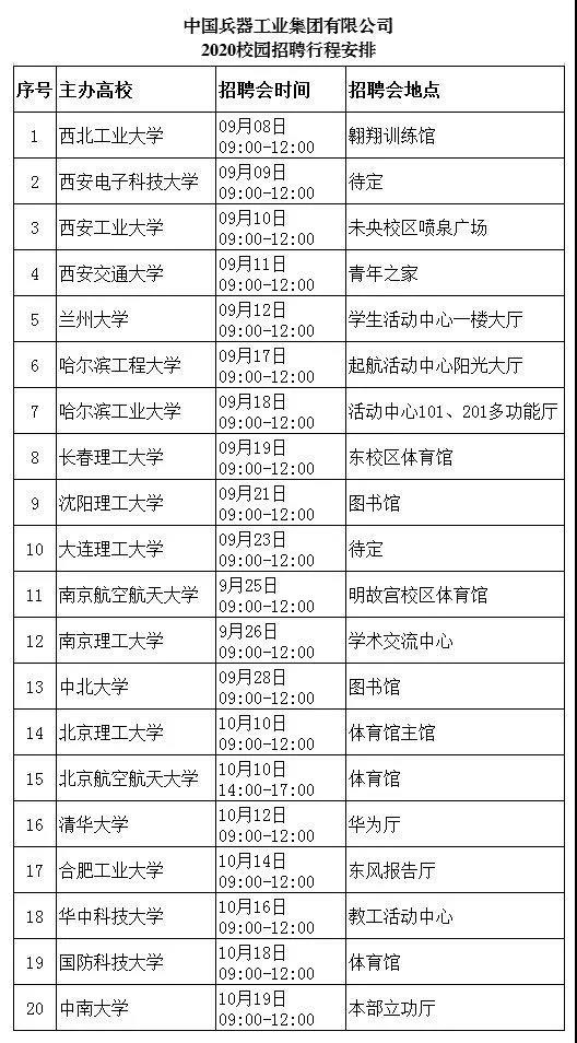 中國(guó)兵器工業(yè)集團(tuán) 2020校園招聘火熱來襲 只等你來哦 有夢(mèng)想的青年,請(qǐng)往下面看 讓我們攜手強(qiáng)軍報(bào)國(guó) 公司簡(jiǎn)介 我們是我軍機(jī)械化、信息化、智能化裝備發(fā)展的骨干 我們是全軍毀傷打擊的核心支撐 我們是現(xiàn)代化新型陸軍體系作戰(zhàn)能力科研制造的主體 我們是國(guó)家“一帶一路”建設(shè)和軍民融合發(fā)展的主力 我們就是 中國(guó)兵器工業(yè)集團(tuán) 我們闊步邁進(jìn)世界一流防務(wù)集團(tuán) 資產(chǎn)總額3960億元 世界500強(qiáng)企業(yè)排名140 中國(guó)制造業(yè)企業(yè)排名第9 連續(xù)15年獲國(guó)資委經(jīng)營(yíng)業(yè)績(jī)考核A級(jí) 招聘信息 面對(duì)2020年離開校園的你們,我們準(zhǔn)備了 >>職位:1500余個(gè) >>招聘人數(shù):3774人 >>專業(yè)涉及: 武器類 武器系統(tǒng)與發(fā)射工程,彈藥工程與爆炸技術(shù),探測(cè)制導(dǎo)與控制技術(shù)等 機(jī)械類 機(jī)械設(shè)計(jì)制造及其自動(dòng)化,車輛工程,工程力學(xué),機(jī)械電子工程等 電子類 電氣工程及其自動(dòng)化,電子信息工程,通信工程,儀器儀表工程等 材料類 金屬材料工程,材料成型及控制工程,高分子材料與工程,材料科學(xué)與工程等 計(jì)算機(jī)類 計(jì)算機(jī)科學(xué)與技術(shù),計(jì)算機(jī)系統(tǒng)結(jié)構(gòu),計(jì)算機(jī)軟件與理論,網(wǎng)絡(luò)工程等 經(jīng)管類 財(cái)務(wù)管理,工商管理,行政管理,人力資源管理,會(huì)計(jì)學(xué),審計(jì)學(xué)等 其他 環(huán)境與安全類,臨床醫(yī)學(xué),語言類,建筑學(xué),法學(xué),采礦工程,化學(xué)類等 行程安排 中國(guó)兵器工業(yè)集團(tuán)2020屆校園招聘會(huì)將在全國(guó)12個(gè)城市、20所高校舉辦,招聘會(huì)具體行程見下表:
