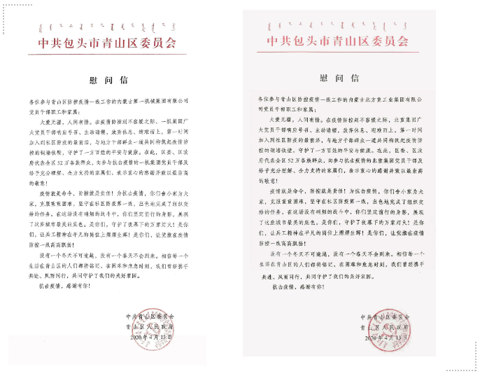一機集團、北重集團收到中共包頭市青山區(qū)委員會、青山區(qū)人民政府發(fā)來的慰問信
