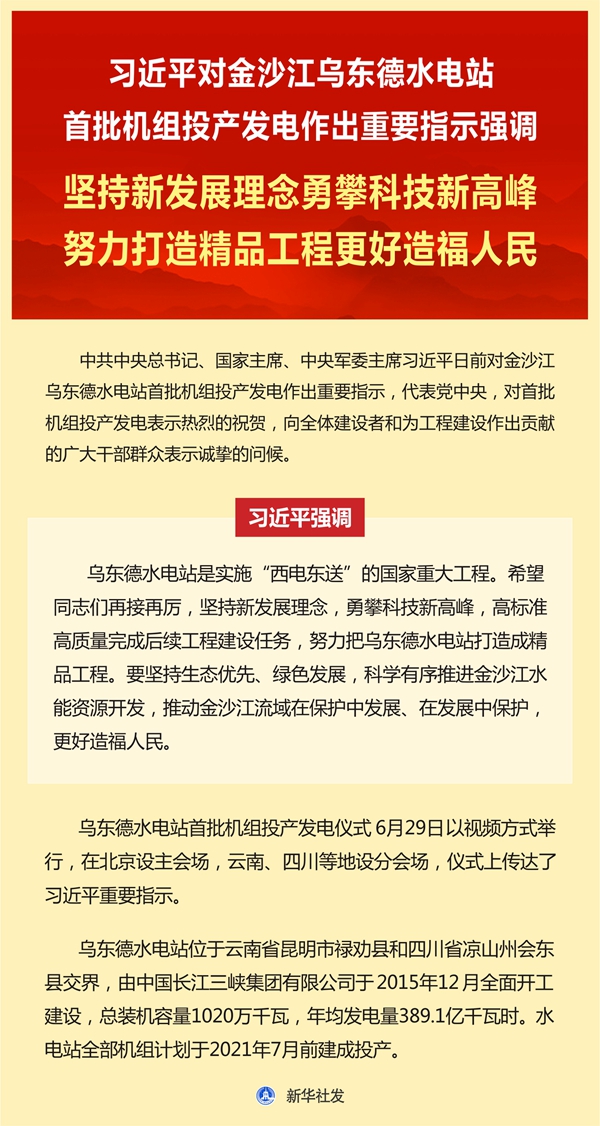 新華社北京6月29日電 中共中央總書記、國(guó)家主席、中央軍委主席習(xí)近平日前對(duì)金沙江烏東德水電站首批機(jī)組投產(chǎn)發(fā)電作出重要指示,代表黨中央,對(duì)首批機(jī)組投產(chǎn)發(fā)電表示熱烈的祝賀,向全體建設(shè)者和為工程建設(shè)作出貢獻(xiàn)的廣大干部群眾表示誠(chéng)摯的問(wèn)候。 習(xí)近平強(qiáng)調(diào),烏東德水電站是實(shí)施“西電東送”的國(guó)家重大工程。希望同志們?cè)俳釉賲?,?jiān)持新發(fā)展理念,勇攀科技新高峰,高標(biāo)準(zhǔn)高質(zhì)量完成后續(xù)工程建設(shè)任務(wù),努力把烏東德水電站打造成精品工程。要堅(jiān)持生態(tài)優(yōu)先、綠色發(fā)展,科學(xué)有序推進(jìn)金沙江水能資源開(kāi)發(fā),推動(dòng)金沙江流域在保護(hù)中發(fā)展、在發(fā)展中保護(hù),更好造福人民。 烏東德水電站首批機(jī)組投產(chǎn)發(fā)電儀式29日以視頻方式舉行,在北京設(shè)主會(huì)場(chǎng),云南、四川等地設(shè)分會(huì)場(chǎng),儀式上傳達(dá)了習(xí)近平重要指示。 烏東德水電站位于云南省昆明市祿勸縣和四川省涼山州會(huì)東縣交界,由中國(guó)長(zhǎng)江三峽集團(tuán)有限公司于2015年12月全面開(kāi)工建設(shè),總裝機(jī)容量1020萬(wàn)千瓦,年均發(fā)電量389.1億千瓦時(shí)。水電站全部機(jī)組計(jì)劃于2021年7月前建成投產(chǎn)。