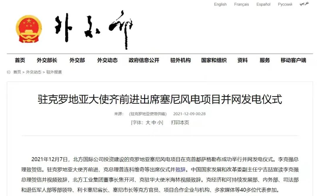 2021年12月7日,中國(guó)兵器工業(yè)集團(tuán)有限公司北方公司所屬北方國(guó)際投資、建設(shè)和運(yùn)營(yíng)的塞尼156MW風(fēng)電項(xiàng)目在克羅地亞首都薩格勒布隆重舉行并網(wǎng)發(fā)電儀式。李克強(qiáng)總理致賀信。克羅地亞總理安德烈·普連科維奇,中國(guó)駐克羅地亞大使齊前進(jìn)出席儀式并致辭。中國(guó)國(guó)家發(fā)展和改革委員會(huì)副主任寧吉喆宣讀李克強(qiáng)總理賀信并視頻致辭,中國(guó)兵器工業(yè)集團(tuán)有限公司董事長(zhǎng)焦開河、克駐華大使米海林視頻致辭。 中華人民共和國(guó)外交部報(bào)道 普連科維奇總理在致辭中表示,感謝李克強(qiáng)總理發(fā)來賀信,他與中國(guó)領(lǐng)導(dǎo)人一直非常重視塞尼風(fēng)電項(xiàng)目投資與建設(shè)。祝賀項(xiàng)目克服疫情與地震等影響,成功并網(wǎng)發(fā)電。增加清潔可再生能源、綠色電力對(duì)克乃至歐洲都很重要,克政府的重要戰(zhàn)略和目標(biāo)之一就是低碳發(fā)展和增加清潔能源供應(yīng)。塞尼風(fēng)電項(xiàng)目占克總發(fā)電量將達(dá)3.5%,對(duì)克實(shí)現(xiàn)2022年可再生能源比例30%目標(biāo)具有很大幫助。此次投資使北方國(guó)際成為在克最大的清潔能源投資企業(yè)。非常歡迎更多中國(guó)企業(yè)擴(kuò)大對(duì)克投資。 寧吉喆宣讀李克強(qiáng)總理賀信并視頻致辭時(shí)表示,2017年11月第六次中國(guó)—中東歐國(guó)家領(lǐng)導(dǎo)人會(huì)晤期間,在李克強(qiáng)總理和普連科維奇總理等中東歐16國(guó)領(lǐng)導(dǎo)人的共同見證下,塞尼項(xiàng)目簽署了協(xié)議。項(xiàng)目既是中國(guó)堅(jiān)定踐行綠色發(fā)展理念的具體體現(xiàn),也是中國(guó)深化與克羅地亞、與中東歐國(guó)家務(wù)實(shí)合作的生動(dòng)實(shí)踐。希望中克兩國(guó)政府部門,企業(yè)等有關(guān)各方共同努力、相互配合,運(yùn)營(yíng)好塞尼項(xiàng)目,打造出中歐綠色合作的樣板,帶動(dòng)兩國(guó)務(wù)實(shí)合作持續(xù)深入發(fā)展,造福兩國(guó)人民。