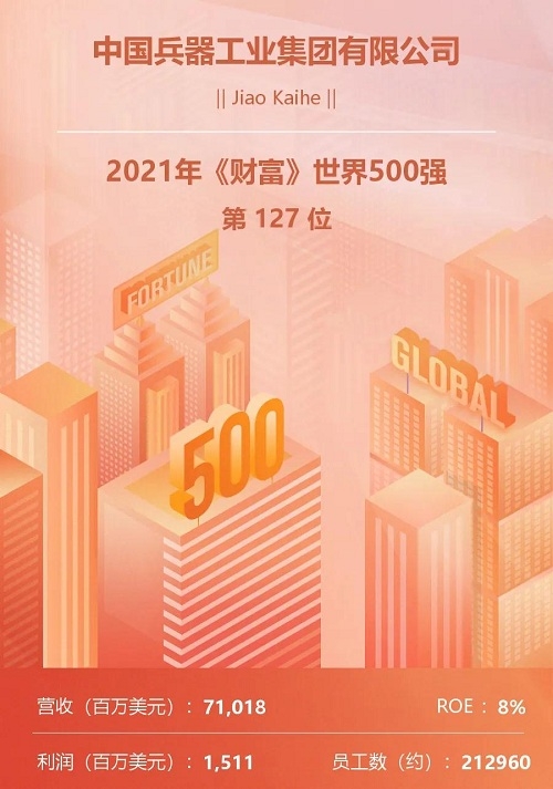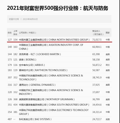 兵器工業(yè)集團位列2021年世界500強第127位 |
