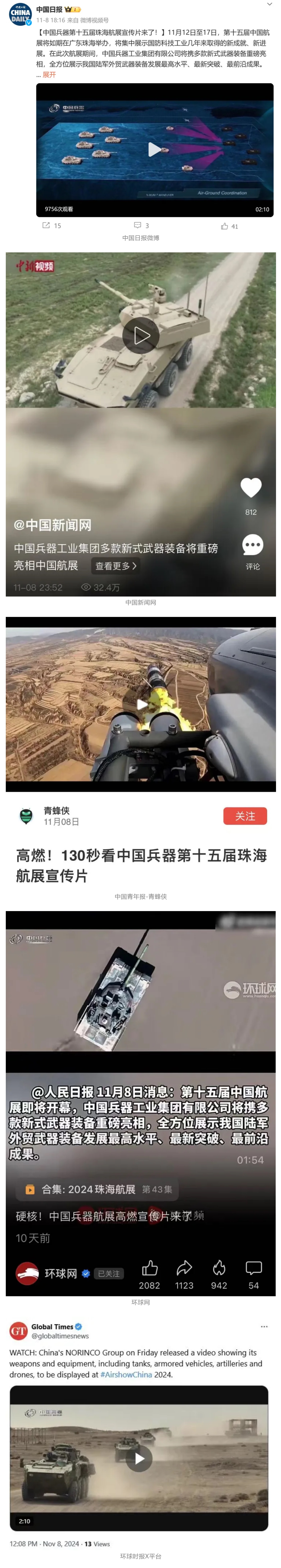 11月13日央視新聞《藍天之約》直播地面裝備動態(tài)演示此次航展,央視綜合頻道《新聞聯(lián)播》《晚間新聞》、新聞頻道《新聞直播間》《新聞30分》《朝聞天下》《共同關注》《東方時空》《午夜新聞》、財經(jīng)頻道《天下財經(jīng)》《經(jīng)濟信息聯(lián)播》《正點財經(jīng)》《第一時間》、中文國際頻道《今日環(huán)球》《中國新聞》、國防軍事頻道《軍事報道》《正午國防軍事》《國防軍事早報》《軍迷行天下》等欄目共播出兵器工業(yè)集團參展相關新聞報道40余條。11月10日央視新聞頻道《新聞30分》11月10日央視中文國際頻道《中國新聞》11月10日央視國防軍事頻道《軍事報道》11月11日央視國防軍事頻道《正午國防軍事》