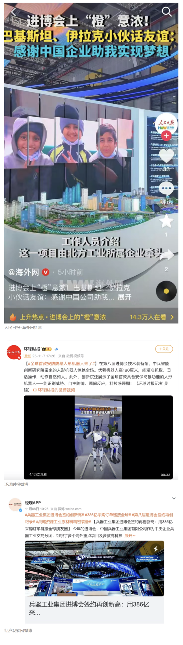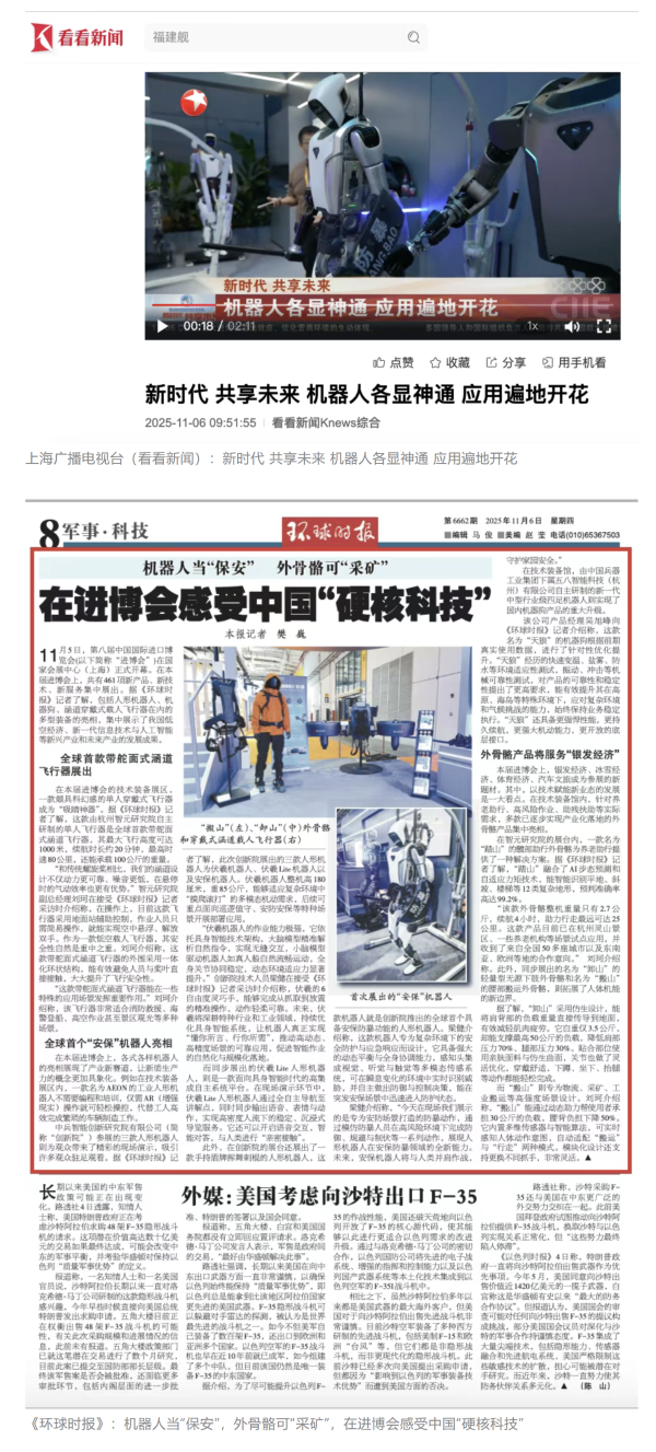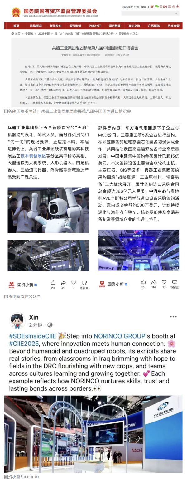 11月5日至10日,中國兵器工業(yè)集團有限公司組團參加第八屆中國國際進口博覽會。集團公司以“堅持合作共贏,推進高水平對外開放,助力構建新發(fā)展格局”為目標,圍繞“新征程,共創(chuàng)未來”主題組團參展,集中展示了一系列新技術、新理念、新成果,取得豐碩成果,受到廣泛關注。 嘉賓云集 本屆進博會上,蒙古國駐華大使、贊比亞礦業(yè)和礦產(chǎn)開發(fā)部常任秘書、津巴布韋首席司長等多國政要蒞臨集團公司組展展區(qū),了解有關項目情況。 國家能源集團、東風汽車、哈電集團、鞍鋼集團、中鋁集團、通用技術集團、中國中車、中國長安汽車、中國電建等央企領導,工信部、國務院國資委、中國貿(mào)促會、陜西省、上海市、浙江省等國內(nèi)政府部門領導以及國內(nèi)外合作伙伴蒞臨集團公司組展展區(qū)參觀指導。對集團公司高質量共建“一帶一路”,與各國合作伙伴共享發(fā)展機遇、實現(xiàn)互利共贏給予高度評價。 媒體關注 集團公司集中簽約亮相央視綜合頻道《新聞聯(lián)播》、央視新聞頻道《朝聞天下》《新聞30分》《共同關注》、央視財經(jīng)頻道《正點財經(jīng)》《經(jīng)濟信息聯(lián)播》。 《環(huán)球時報》、環(huán)球網(wǎng)、《新京報》、《中國旅游報》等對集團公司人形機器人、四足機器人、涵道穿戴式載人飛行器、外骨骼等多型新域新質產(chǎn)品,集中亮相進行報道。新華社、央廣中國之聲、新京報(貝殼財經(jīng))、上海廣播電視臺等媒體直播探館,打卡兵器“硬核科技”。 人民日報客戶端、新華社客戶端、人民網(wǎng)、中國網(wǎng)、中國日報網(wǎng)、國務院國資委網(wǎng)站、國資小新微信公眾號、國資小新Facebook、學習強國中央企業(yè)學習平臺、經(jīng)濟觀察網(wǎng)、新京報客戶端等第一時間刊發(fā)集團公司組展簽約、ESG建設等情況。新浪財經(jīng)、界面新聞等商業(yè)平臺閱讀量累計超500萬次。 在微博、抖音等新媒體平臺上,集團公司高科技產(chǎn)品演示、5D穹幕電影體驗等短視頻持續(xù)引爆流量,累計播放量超800萬次,點贊量破50萬?!氨鞴I(yè)集團進博會簽約386億”相關話題登上微博熱搜榜,閱讀量破5000萬次。 文字丨劉暢 |